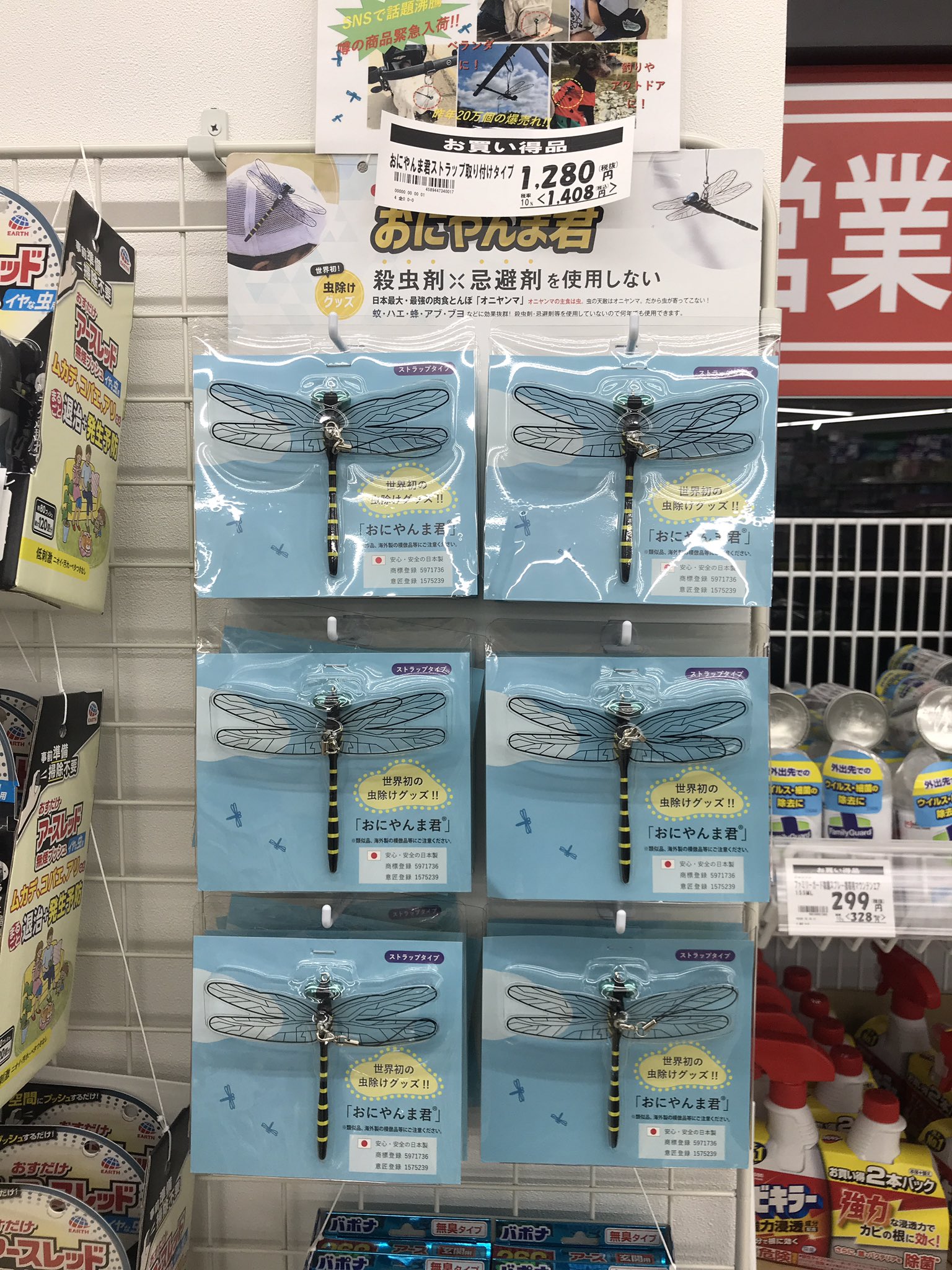 「オニヤンマくん」の類似品「虫除けオニヤンマ」がセリアにあると聞いて置いてるか確認の電話したら、事情により販売中止になってるらしい。
