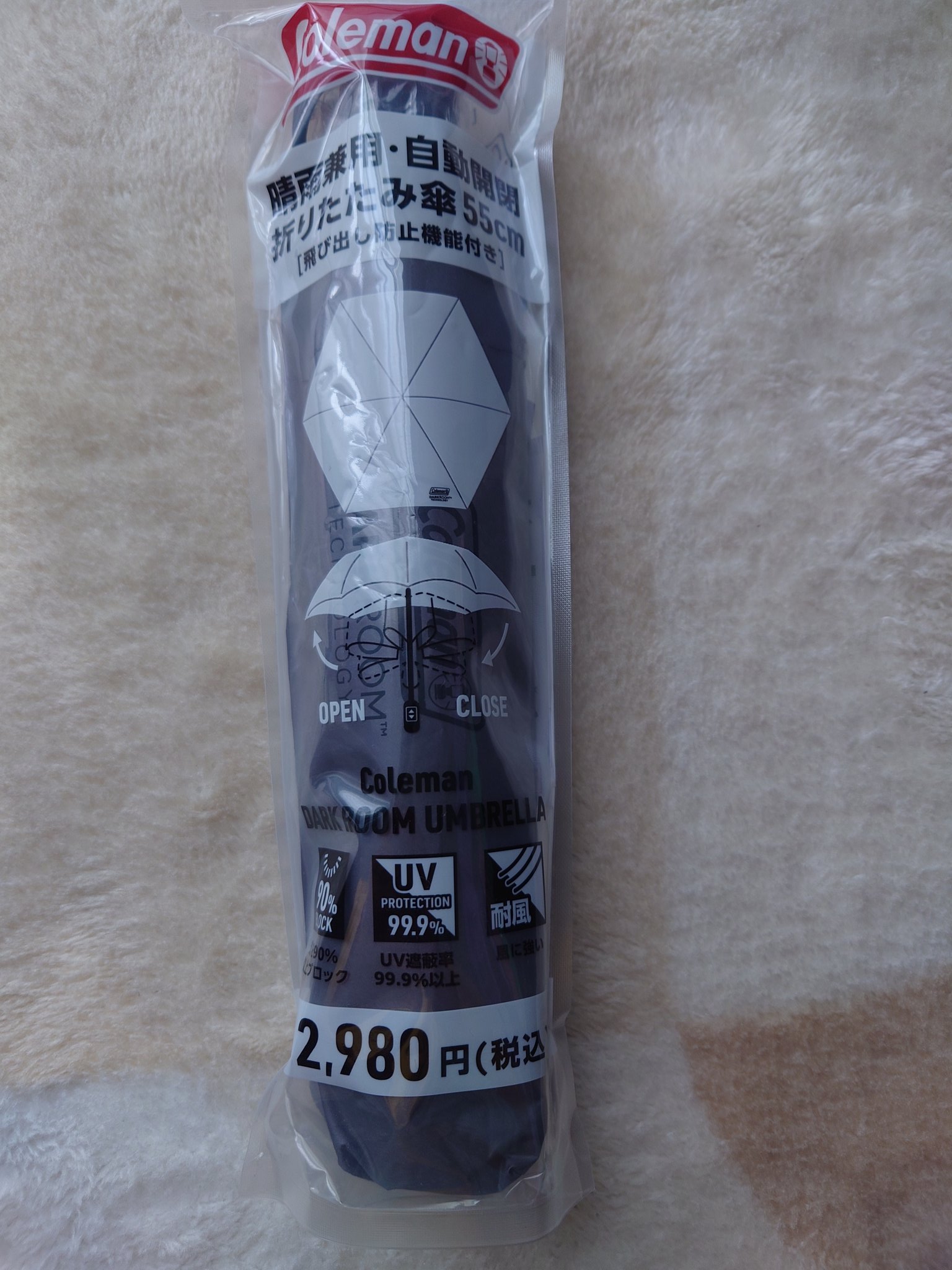 ローソン限定コールマン傘の価格は約3,878円前後です。自動開閉タイプでワンタッチ操作ができ、UVカット機能付きの晴雨兼用タイプ。耐風構造がしっかりしていて、アウトドアにも日常にも使いやすい設計です。